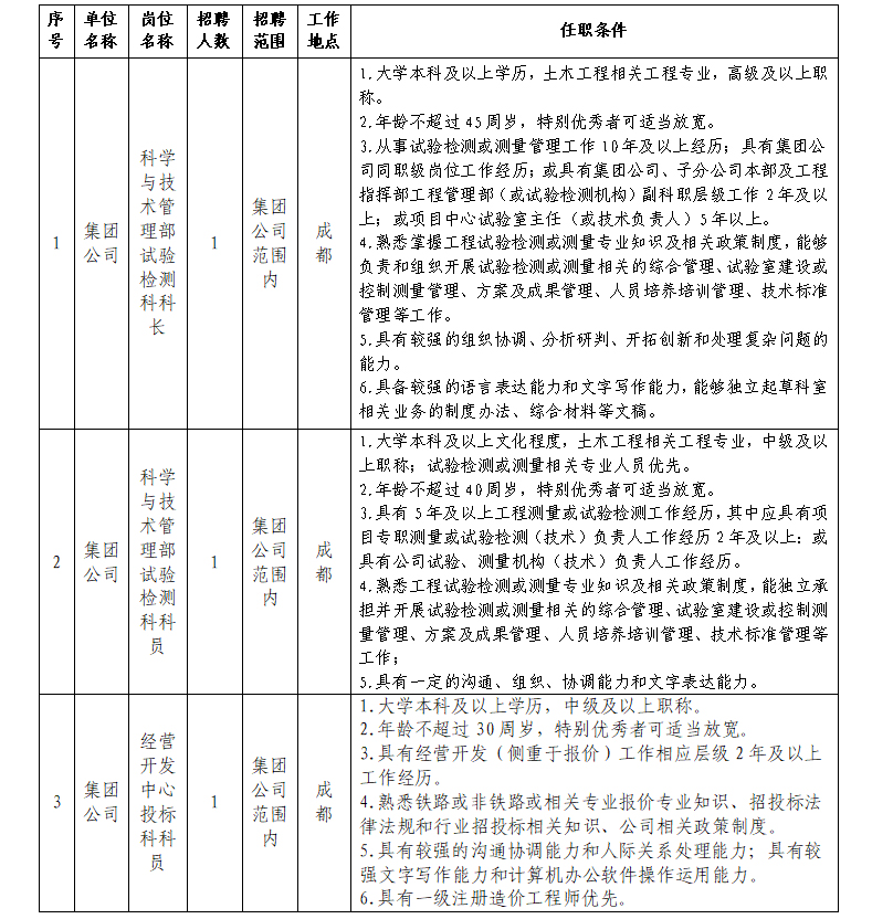 此次公開(kāi)競(jìng)聘主要包含2個(gè)崗位,主要為集團(tuán)公司科學(xué)與技術(shù)管理部試驗(yàn)檢測(cè)科,經(jīng)營(yíng)開(kāi)發(fā)中心投標(biāo)科,競(jìng)聘情況詳見(jiàn)下表。
